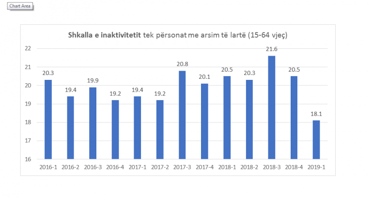 Sipas të dhënave nga INSTAT, në tremujorin e parë të vitit 2019, 18.1% e personave me arsim të lartë në moshë punë ishin inaktivë.