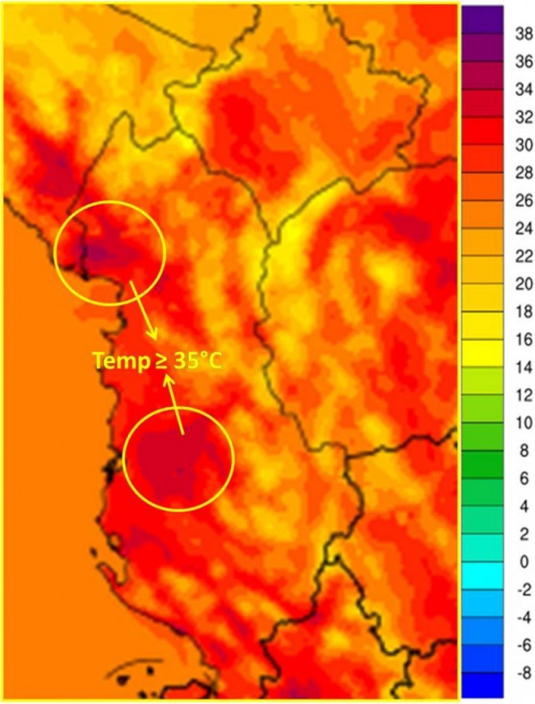 E diela, mbetet e kthjellët në bregdet ndërsa vranësira kalimtare do ketë në pjesën tjetër të vendit; më të shpeshta në Veri – Verilindje ku priten shira afatshkurtër. Fundjava nuk do të sjellë ndryshime të ndjeshme të vlerave termike, ekstremumet ditore pritet të luhaten nga 13°C mëngjesi më i freskët në Juglindje deri në 35-36°C, maksimumi termik në zonat Perëndimore.