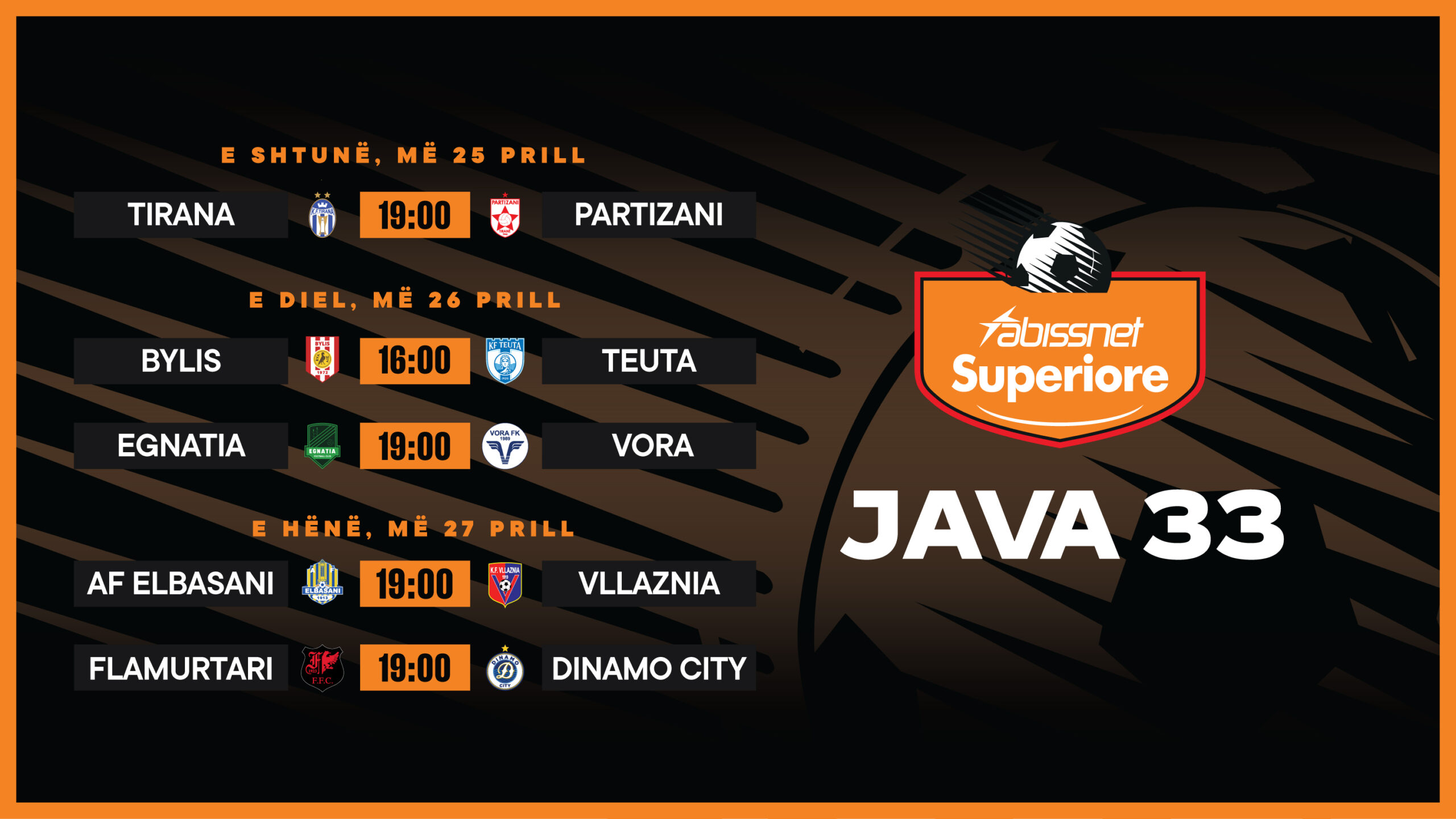 ava e 33-të e kampionatit “Abissnet Superiore” hapet me një nga përballjet më të shumëpritura të sezonit, derbin e fundit të kryeqytetit për këtë edicion mes Tiranës dhe Partizanit. Një sfidë me peshë të madhe për të dyja skuadrat, që synojnë maksimumin për të përmbushur objektivat e tyre në këtë fazë vendimtare të kampionatit. Takimi do të zhvillohet më 25 prill, në stadiumin “Air Albania”, duke nisur nga ora 19:00.