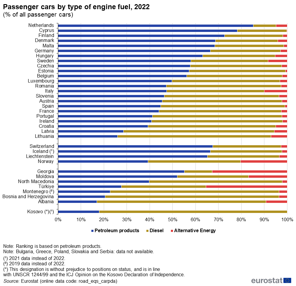 Të dhënat krahasuese të Eurostat bëjnë të ditur se Shqipëria dhe Kosova kanë peshën më të lartë të automjeteve që punojnë me naftë në Europë, me rreth 74% të totalit Shqipëria dhe rreth 82% Kosova për vitin 2022.