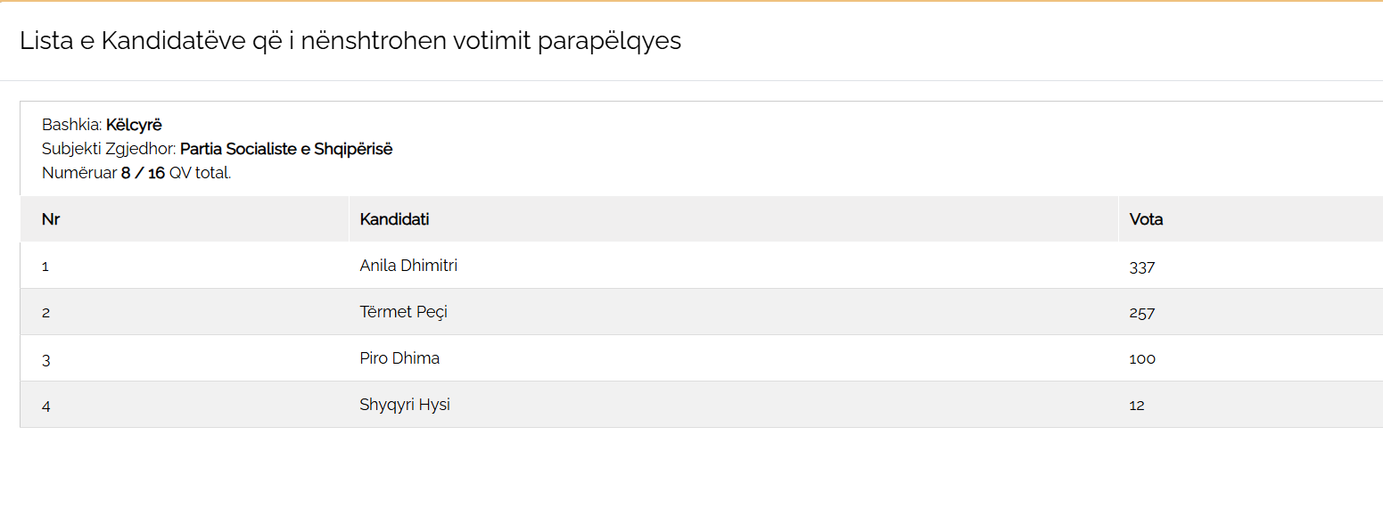 Anila Dhimitri ka marrë më shumë vota në Bashkinë Këlcyrë sesa kandidatët e tjerë në listë të hapur të PS-së. Pas saj vjen Tërmet Peci, Piro Dhima dhe në fund Shyqyri Hysi. Në listën e hapur të PD-së, më shumë vota në këtë bashki ka marrë Bajram Hysa. Më pas vjen Alma Kore, Arben Ristani dhe Mariklen Dervishi.