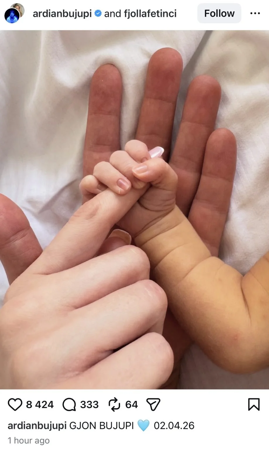 Artisti ka zgjedhur një mënyrë shumë intime për ta ndarë këtë moment të veçantë. Në fotografinë e publikuar, dora e vogël e të porsalindurit shihet teksa shtrëngon gishtin e prindërve, një simbol i fortë i lidhjes dhe dashurisë familjare, që ka emocionuar mijëra fansa.