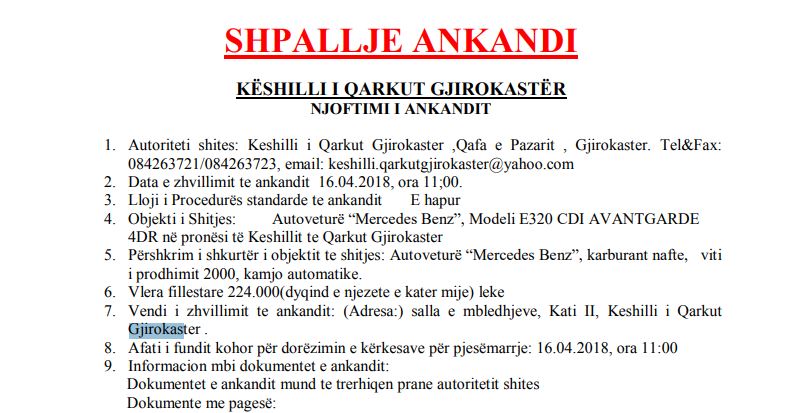 Këshilli i Qarkut Gjirokastër ka njxerrë në ankand automjetin që përdorte ky institucion. Sipas njoftimit bëhet fjalë për një autoveturë tip ‘Mercedes Benz’, modeli E 320 CDI Avantgarde, viti i prodhimit 2000. Vlera fillestare e ankandit është 2 milionë e 240 mijë lekë të vjetra, ndërsa data e fundit për pjesëmarrje është 16 prilli. Pas shitjes së këtij automjeti, rrjedhimisht institucioni i Këshillit të Qarkut, në krye të së cilit është Armand Hilaj, do të blejë një makinë të re me fondet e veta, ose mjeti do të dhurohet përmes Ministrisë së Brendshme, ashtu sikundër iu dhurua 12 prefektëve të vendit në fillim të këtij viti.