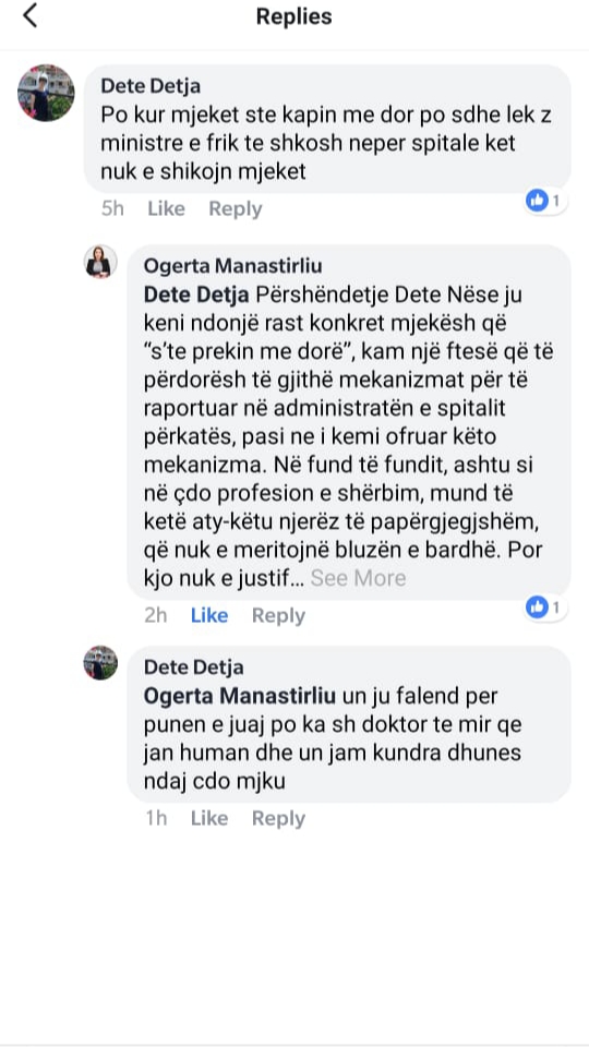 Ministrja e Shëndetësisë dhe Mbrojtjes Sociale, Ogerta Manastirliu ka replikuar me një komentuese e cila ironikisht e ka pyetur në lidhje me mjekët dhe shërbimin në spitale “Po kur mjekët nuk të prekin me dorë dhe ke frike të shkosh në spital…”. Kam një ftesë që të përdorësh të gjithë mekanizmat për të raportuar në administratën e spitalit përkatës, kjo nuk e justifikon kurrë, futjen e të gjithë mjekëve në të njëjtin thes.” i është përgjigjur Ministrja.
