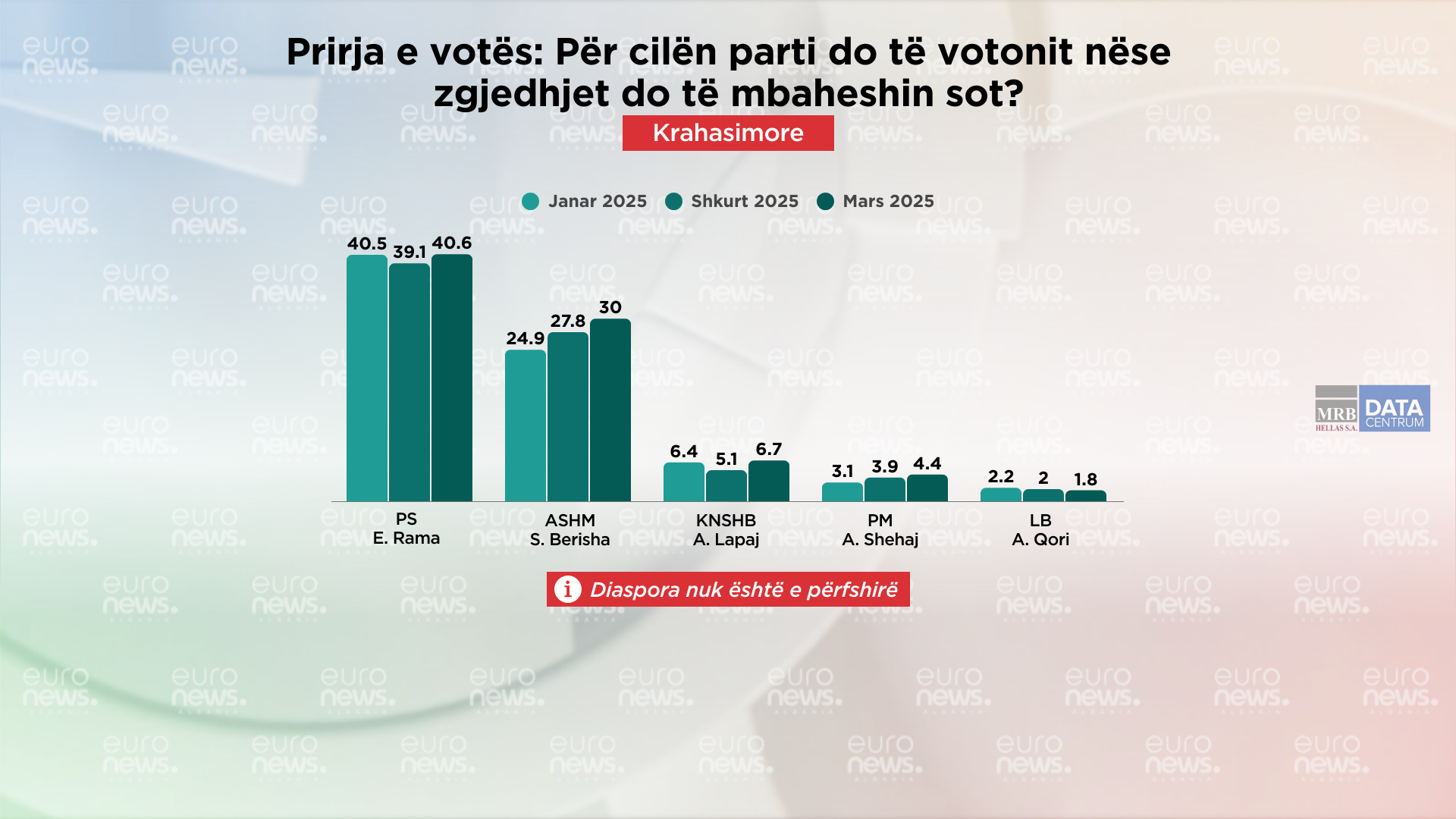 Barometri Euronews Albania ka zhvilluar matjen e tretë zgjedhore në nivel vendi. Metodologjia e përdorur është sërish kampion rastësor i shtresëzuar dhe madhësia e kampionit ka qenë 1600 qytetarë të pyetur në gjithë territorin e Shqipërisë, ballë për ballë. Periudha kohore e mbledhjes së të dhënave për matjen e tretë zgjedhore të Barometrit Euronews Albania është 22 mars-03 prill 2025.