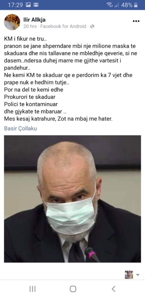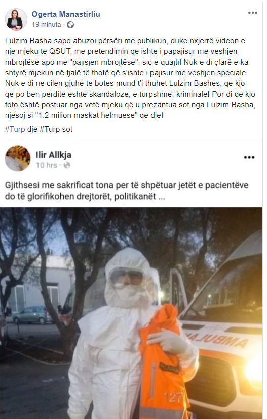 “Lulzim Basha sapo abuzoi përsëri me publikun, duke nxjerrë videon e një mjeku të QSUT, me pretendimin që ishte i papajisur me veshjen mbrojtëse apo me “pajisjen mbrojtëse”, siç e quajti!