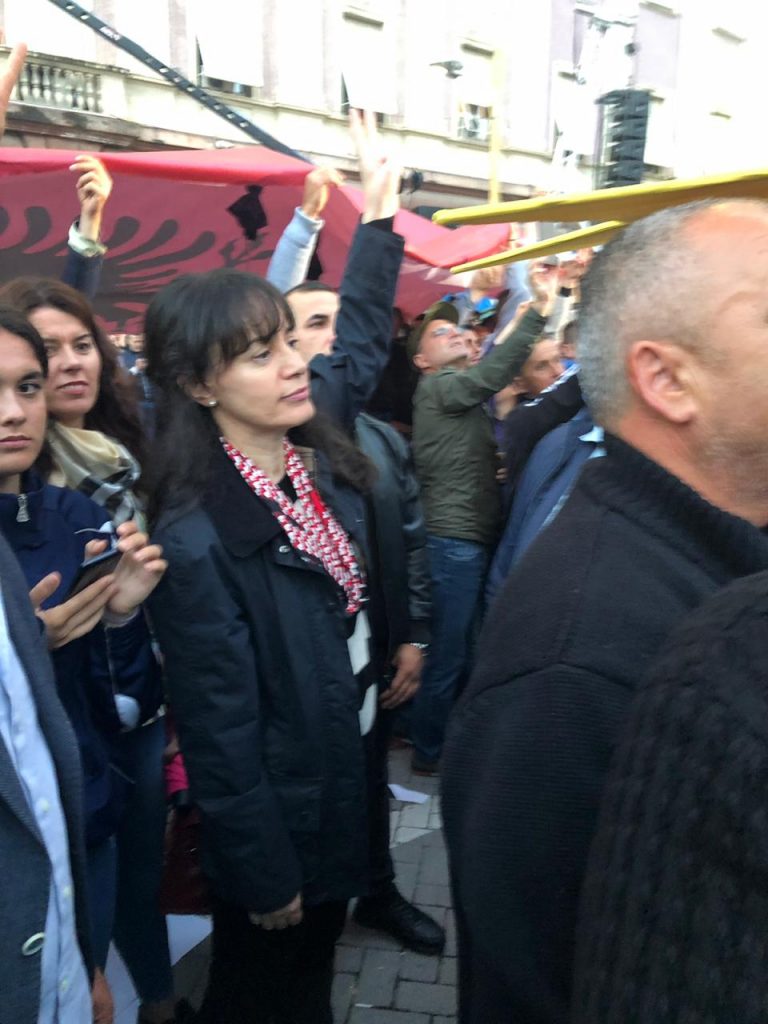 Bashkëshortja e Lulzim Bashës në protestë, ndjek fjalimin e kryetarit të PD-së (FOTO)