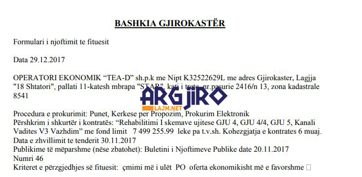 Bashkia Gjirokastër ka shpallur fituesin e tenderit për rehabilitimin e disa kanaleve ujitëse. Sipas dokumentave që sjell ArgjiroLajm.net tenderi është fituar nga kompania ‘TEA-D” Sh.p.k me adresë në Gjirokastër. Vlera e punimeve llogaritet në rreth 90 milionë lekë të vjetra me tvsh. Punimet pritet të zgjasin gjashtë muaj nga momenti i lidhjes së kontratës. Bashkia thotë se përzgjedhja e kësaj kompanie u bë mbi bazën e kriterit të ofertës ekonomike më të favorshme.
