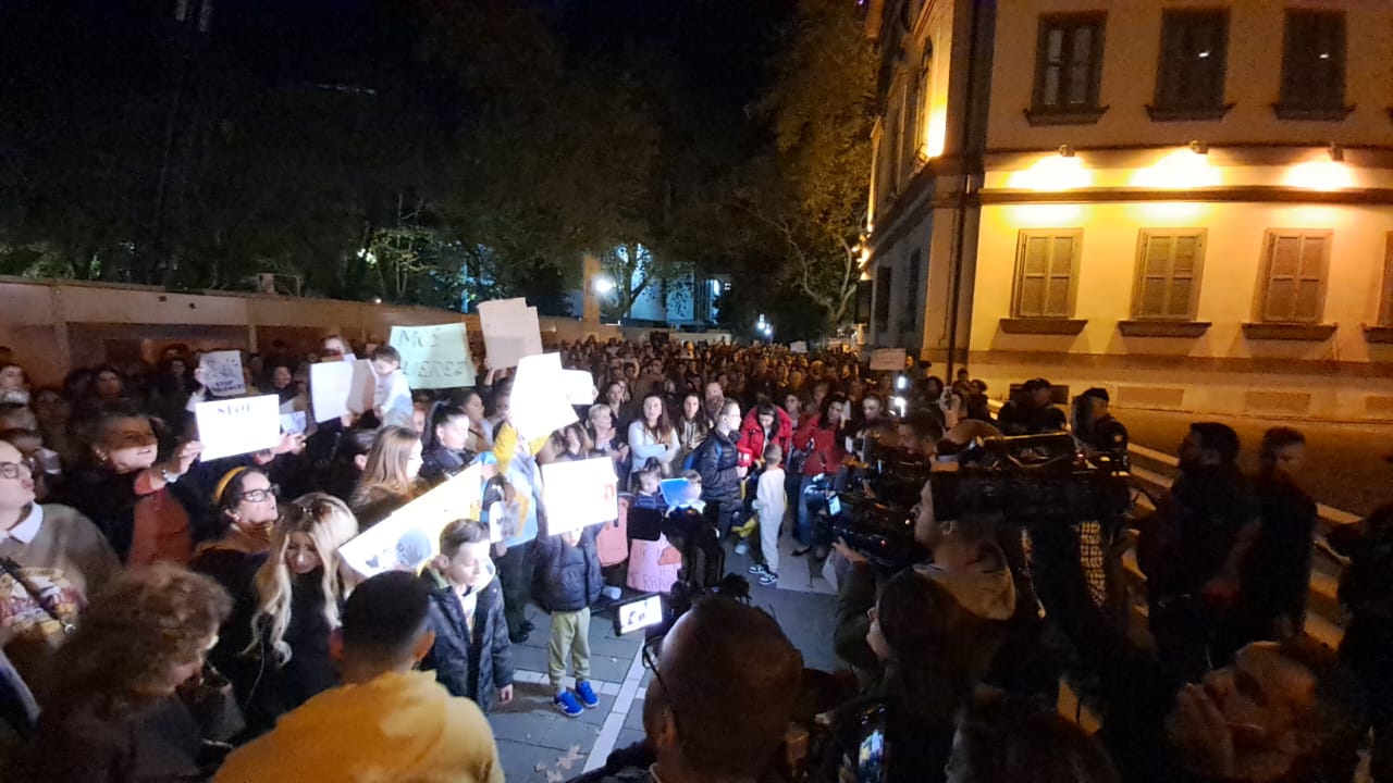 Qindra qytetarë dolën në protestë pasditen e kësaj të enjteje përballë Ministrisë së Arsimit, kundër heshtjes së institucioneve pas dhunimit të 3-vjeçareje në kopshtin e palicensuar në Tiranë. Sot është arrestuar edukatorja që i theu këmbën të miturës, Majlinda Dehima por ngjarja u tentua të mbulohej nga heshtja. Jo vetëm nga policia që kërkoi të fshihte pamjet e ngjarjes por edhe nga Ministria e Arsimit që kishte lejuar një kopësht pa licensë në Tiranë. Protesta u zhvendos gjithashtu edhe përpara Ministrisë së Brendshme.