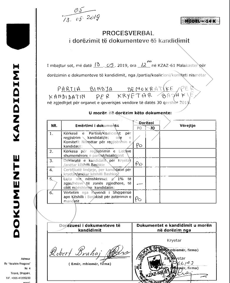 Bindja Demokratike në një deklaratv për mediat zyrtarizoi listën e emrave prej 25 kandidatësh, si dhe njoftoi për 50 emra të qenë në listat e këshilltarëve bashkiakë. CNA.al ka siguruar dokumentin ku konfirmohet se një tjetër kandidat i është shtuar Bindjes Demokratike. Ai është Robert Brahaj dhe do të kandidojë në Bashkinë e Mallakastrës, duke bërë që në këtë Bashki të mos ketë vetëm kandidatë për këshilltarë por edhe një kandidat për Kryetar.