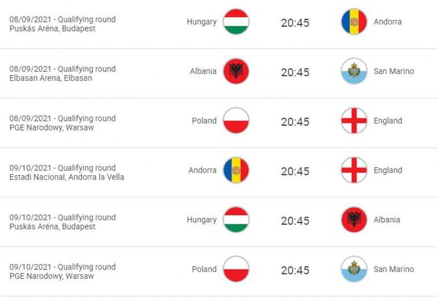 Më pas ndeshjet kualifikuese do të rikthehen sërish në muajin tetor, teksa në datën 9 tetor, Shqipëria do të jetë mysafire në Hungari, ndërkohë që Polonia do të ndeshet me San Marinon dhe Andorra me Anglinë.