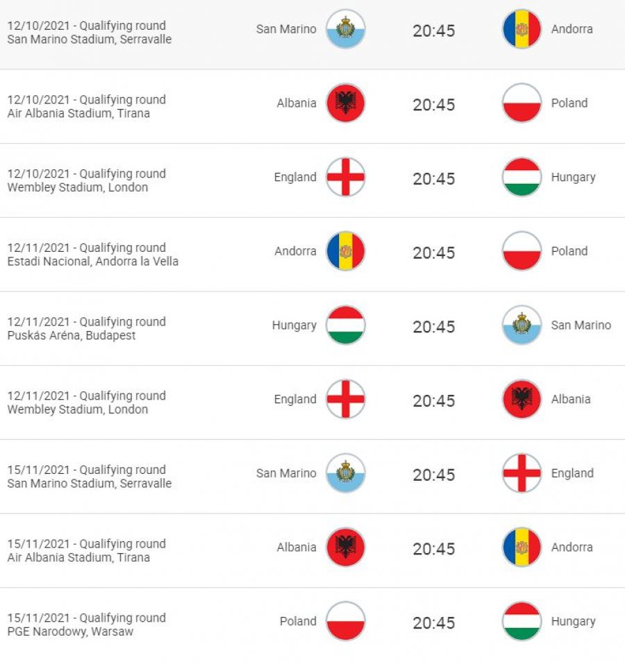 Më pas ndeshjet kualifikuese do të rikthehen sërish në muajin tetor, teksa në datën 9 tetor, Shqipëria do të jetë mysafire në Hungari, ndërkohë që Polonia do të ndeshet me San Marinon dhe Andorra me Anglinë.