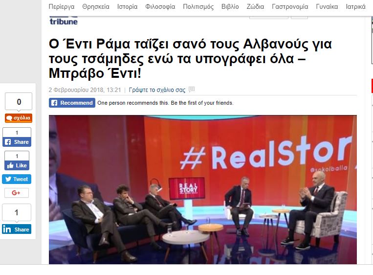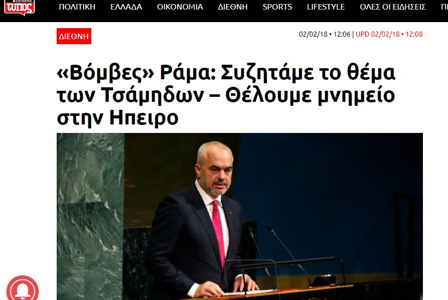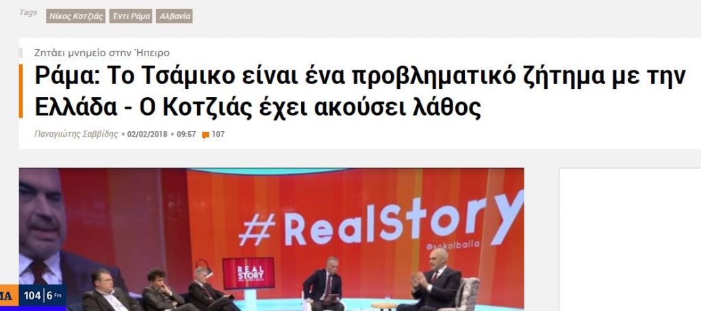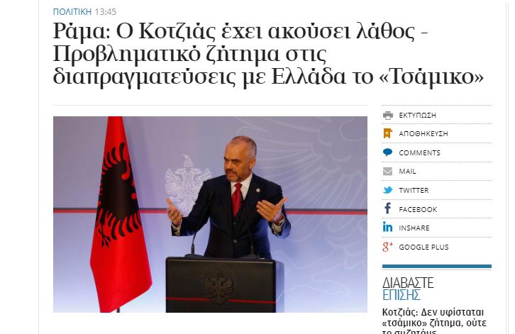 Deklaratat e kryeministrit Edi Rama për çështjen çame, teksa ishte në emisionin ‘Real Story’ në Vizion Plus, kanë marrë një vëmendje të madhe nga mediat greke. Në tituj dominon ajo që tha Rama se çështja çame është diskutuar në tryezën e bisedimeve me Greqinë, por se ministri Nikos Kotzias, ndoshta nuk e ka dëgjuar, si dhe propozimi për të ndërtuar një përkujtimore në Greqi për nder të çamëve të masakruar. Sipas mediave te vendit fqinj kryeministri shqiptar ka përgënjeshtruar ministrin e jashtëm grek Nikos Kotzias i cili kishte thene se ceshtja çame nuk ekziston. Më poshtë po rendisim disa prej titujve të mediave greke kryesore për këtë çështje.