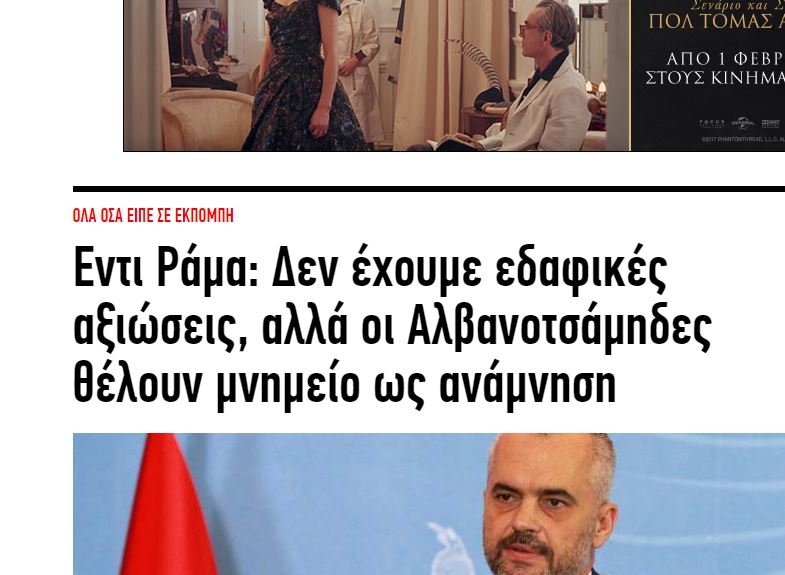 Edi Rama: Nuk kemi pretendime territoriale, por çamët duan një memorial përkujtues