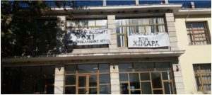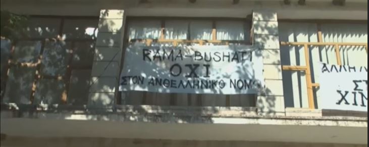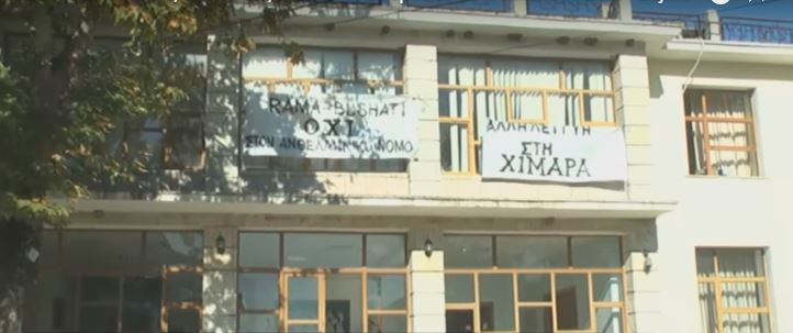 Por teksa po hynin në shtëpinë e kulturës, aty ku do të zhvillohej takimi, dy ministrat u përballën me dy banderola të varura në mur. Siç shihet në fotot më poshtë, në një prej banderolave shkruhet “Rama-Bushati, Jo, ligjit antigrek’, ndërsa në banderolën tjetër shprehej mbështetja për Himarën teksa shkruhej ‘Solidaritet me Himarën’.