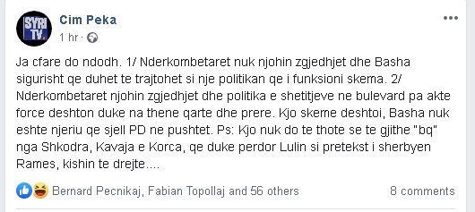 Ps: Kjo nuk do te thote se të gjithe “bq” nga Shkodra, Kavaja e Korca, që duke përdor Lulin si pretekst i shërbyen Ramës, kishin të drejtë…”-shkruan Peka.