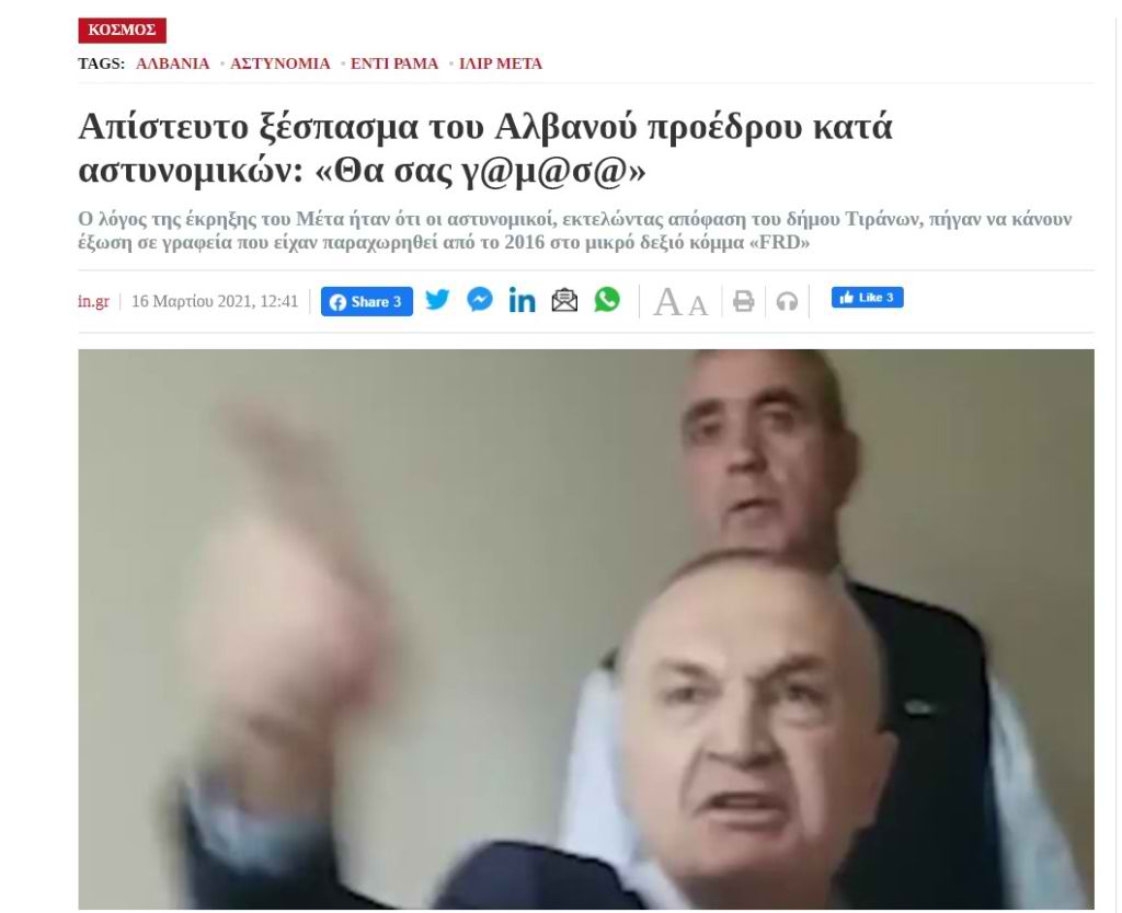 “Shperthim i pabesueshëm i presidentit shqiptar kundër policisë” shkruan portali grek. Më pas përshkruhet me detaje konflikti i tij me kryeministrin Edi Rama.