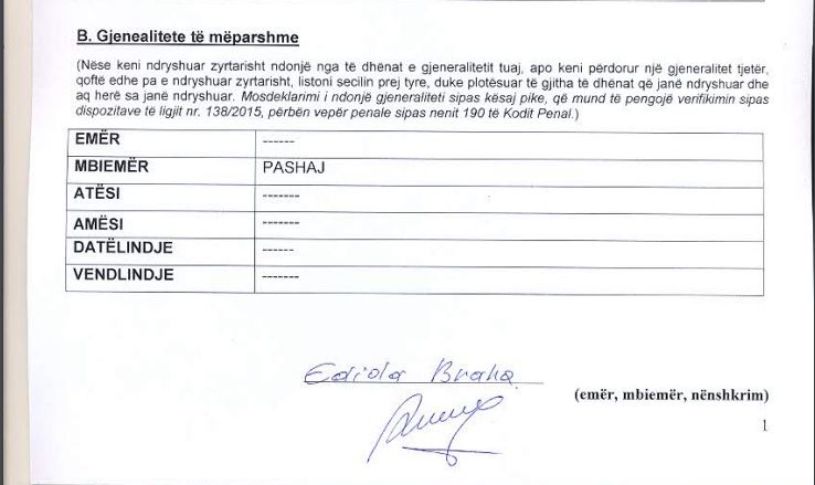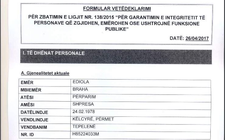Referuar formularit të vetëdeklarimit për ligjin e dekriminalizimit, Ediola Braha rezulton e padënuar më parë, ndërsa thotë se ka qenë në Athinë për pushime në periudhën nëntor 2002-janar 2003.