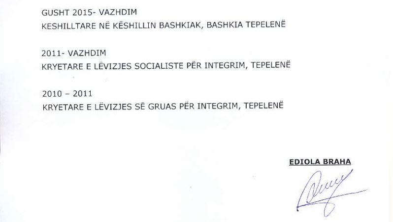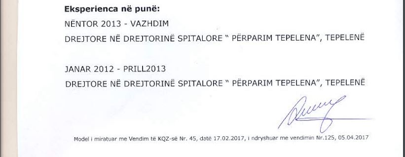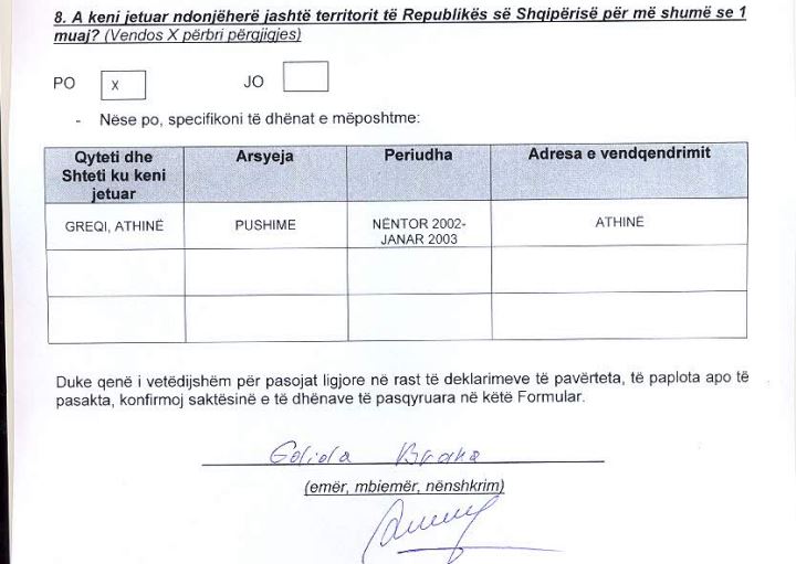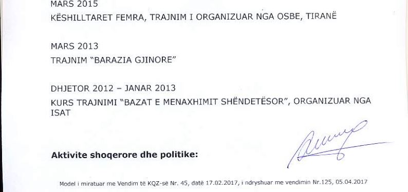 Më poshtë pjesë nga formulari i dekriminalizimit dhe CV-ja e saj.