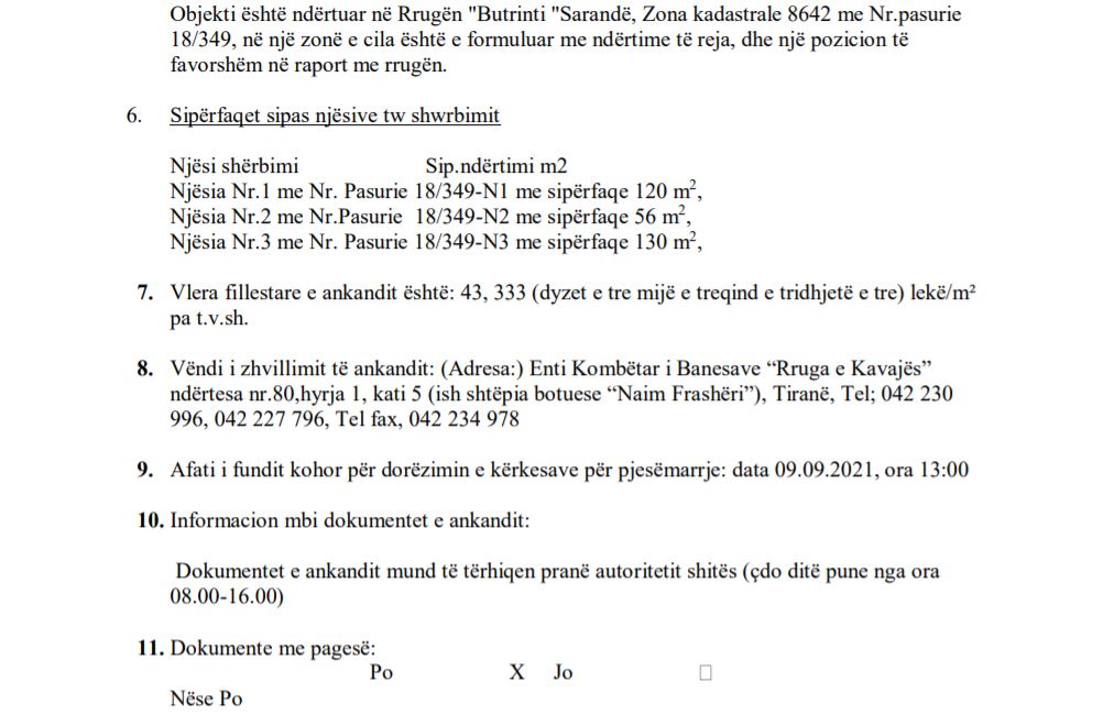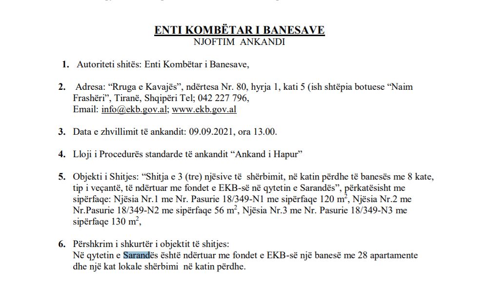 Enti Kombëtar i Banesave, institucion që drejtohet nga ish-kryebashkiaku i Sarandës, Stefan Çipa, ka nxjerr në ankand tre prona po në qytetin e Sarandës. Sipas njoftimit publik, bëhet fjalë për për tre njësi shërbimi që janë në katin përdhe të një banese tetë kate të ndërtuar me fondet e Entit Kombëtar të Banesave. Njësia e parë ka sipërfaqen 120 m2, njësia e dytë ka sipërfaqen 56 m2 dhe njësia e tretë ka sipërfaqen 130 m2. Pronat ndodhen në rrugën “Butrinit”, zona kadastrale 8642. Sipas njoftimit vlera fillestare e ankandit është: 43, 333 (dyzet e tre mijë e treqind e tridhjetë e tre) lekë/m² pa t.v.sh. Më poshtë njoftimi i plotë. ©argjiroja.net