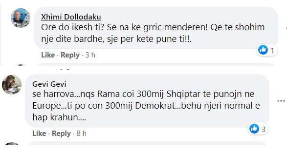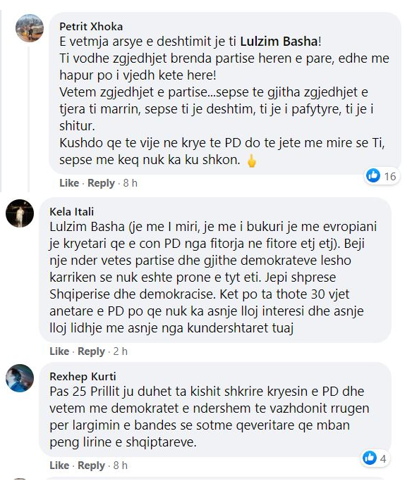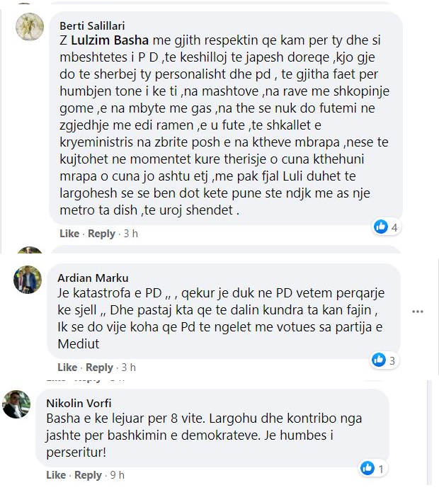 Më tej një tjetër shkruan “Basha e ke lejuar per 8 vite. Largohu dhe kontribo nga jashte per bashkimin e demokrateve. Je humbes i perseritur”.