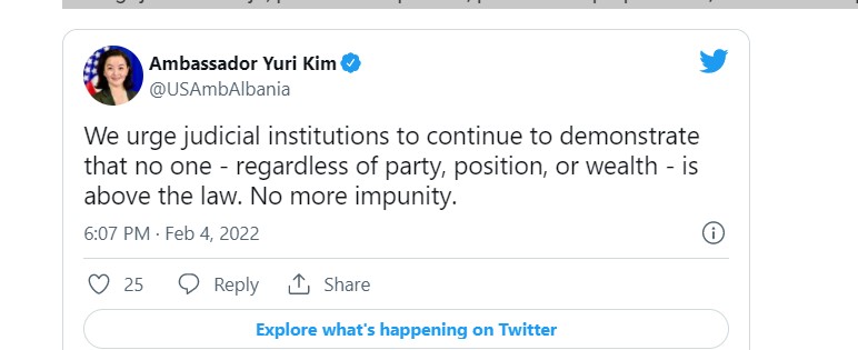“Nuk ka më pandëshkueshmëri.” Ky është reagimi që ka bërë ambasadorja amerikane Yuri Kim pas dënimit me burg të ish-ministrit të Brendshëm, Saimir Tahiri.
