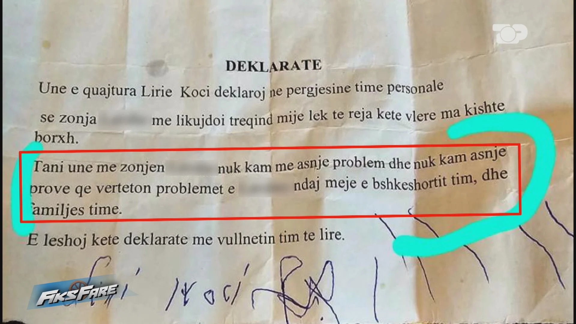 Ai i thotë se polic Jonuzi kishte në telefon foto të saj nudo dhe se po ai vetë i kishte thënë që e ka shantazhuar qytetaren. Fiks Fare solli me zë dhe figurë këtë person kur thotë se “Jonuzi kishte video dhe foto”. Qytetarja e shantazhuar u dha gazetarëve një deklaratë, që gruaja e policit kishte firmosur në të cilën thuhej se denoncuesja i ka dhënë 3 milionë lekë se jua kishte borxh dhe po në të njëjtën deklaratë, gruaja e policit, Liri Koçi thotë se nga ai moment nuk ka më prova se qytetarja ka lidhje me të shoqin.