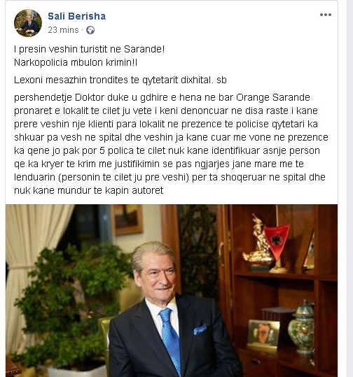 Ish-kryeministri Sali Berisha ka publikuar sot denoncimin e një qyetari, sipas të cilit një turisti në Sarandë i kanë prerë veshin në prezencë të policië, por kjo e fundit ka fshehur krimin.