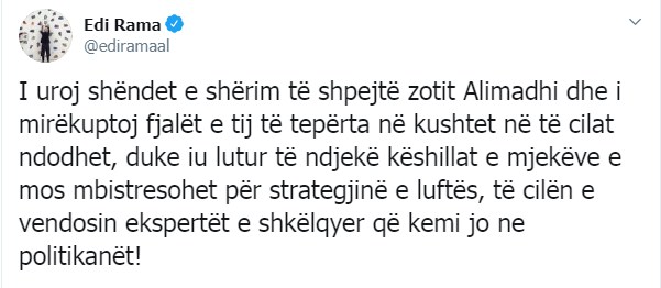 I uroj shëndet e shërim të shpejtë zotit Alimadhi dhe i mirëkuptoj fjalët e tij të tepërta në kushtet në të cilat ndodhet, duke iu lutur të ndjekë këshillat e mjekëve e mos mbistresohet për strategjinë e luftës, të cilën e vendosin ekspertët e shkëlqyer që kemi jo ne politikanët!
