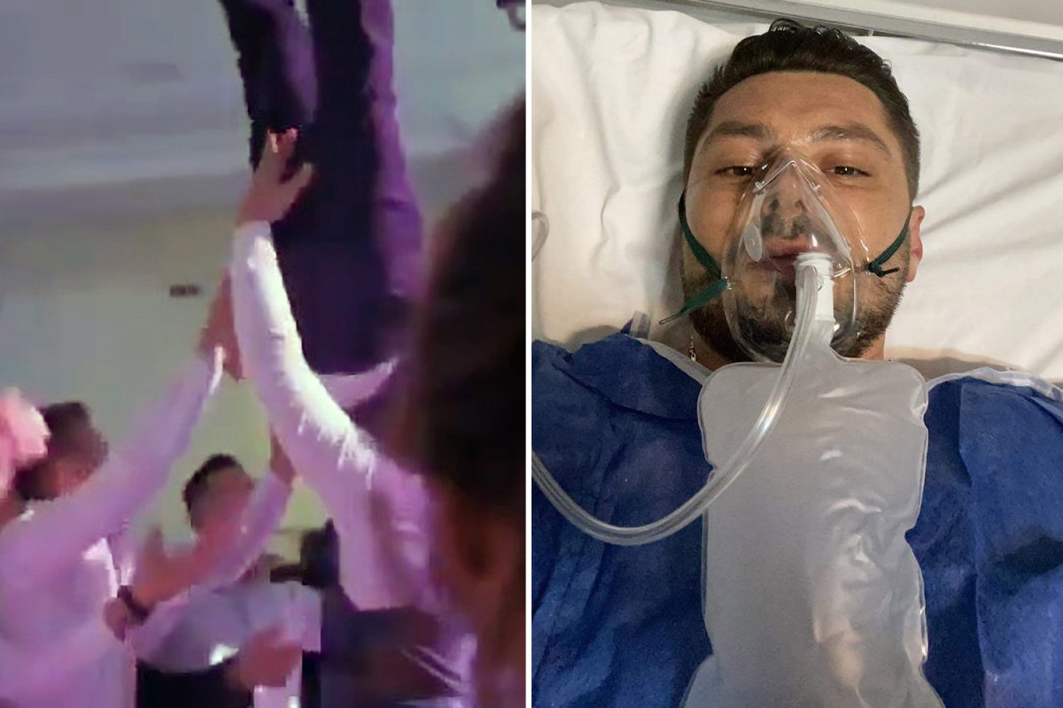 Teksa po festonin dasmën e mikut të tyre, shokët e kanë hedhur dhëndrin në ajër si një gjest tradicional në Rumani.