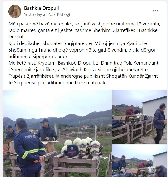Mbrëmjen e shkuar një çift të moshuarish në Dropull humbën jetën pasi banesa e tyre u përfshi nga flakët. Për shkak të largësisë dhe rrugës së keqe, shërbimi zjarrfikës nuk mund të mbërrinte më herët me shpresë se mund t’u shpëtonte jetën. Si për ironi të fatit, disa orë përpara ngjarjes, Bashkia Dropull kishte shpërndarë disa foto në faqen e saj, ku shihen pajisje të reja që iu dhuruan shërbimit zjarrfikës nga një shoqatë.