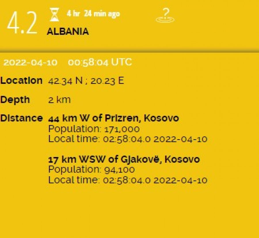 Sipas “EMSC”, epiqendra e tërmeti ishte nw Llugaj të Tropojës me magnitudë 4.2 Rihter dhe thellësi 2 km. Lëkundjet janë ndierë rreth orës 02:58 të mëngjesit të sotëm ndërsa deri në këto momente nuk raportohet për të lënduar apo dëme materiale.