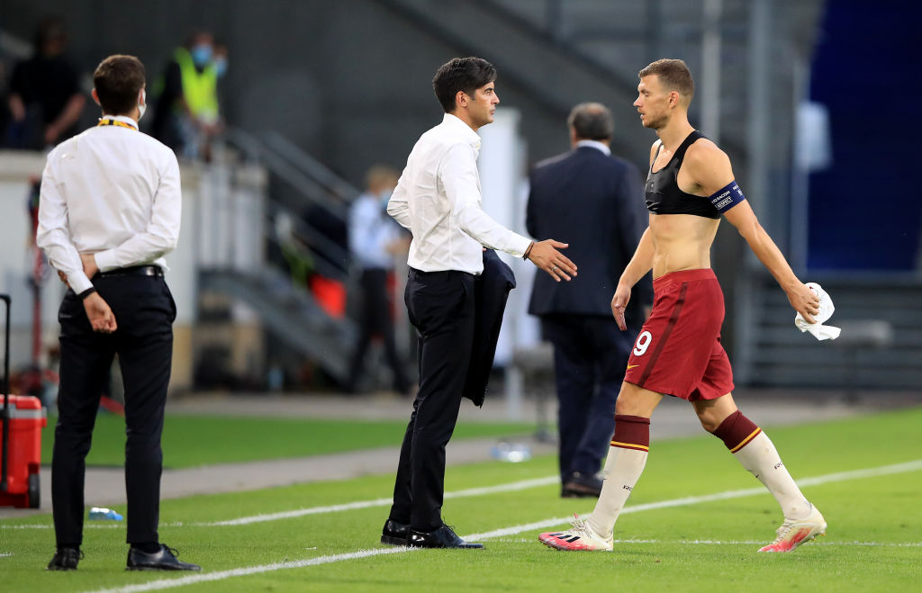 DUISBURG, GERMANY – AUGUST 06: Nikola Kalinic of Roma walks past Paulo Fonseca, Manager of Roma during the UEFA Europa League round of 16 single-leg match between Sevilla FC and AS Roma at MSV Arena on August 06, 2020 in Duisburg, Germany. (Photo by Wolfgang Rattay/Pool via Getty Images)
