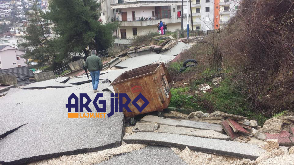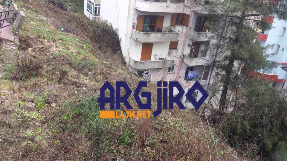 Ky që shihni në foto është pallati 8 katësh në lagjen ‘Kodra e Shtufit’ që rrezikon të shembet. Masivet me baltë janë ngjeshur pas pallatit, duke depëruar deri në apartamentet e katit të dytë. Forca që ushtrohet është e madhe dhe rrezikon themelet e objektit. Sipër tij është rruga e cila është shkatërruar plotësisht. Bashkë me pallatin që shihni në foto rrezikojnë të shemben edhe dy vila aty pranë. Bashkia Gjirokastër ka marrë vendim për evakuimin e banorëve. Ato do të strehohen në konviktin e shkollës pedagogjike.