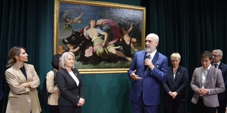 Me “valle” dhe piktura i ka pritur Kryeministri Edi Rama liderët në Samitin e Procesit të Berlinit. Të vendosur në rreth, ata kanë shijuar një performancë baleti dhe më pas, Kryeministri u ka treguar një tjetër ambient me pikturën.