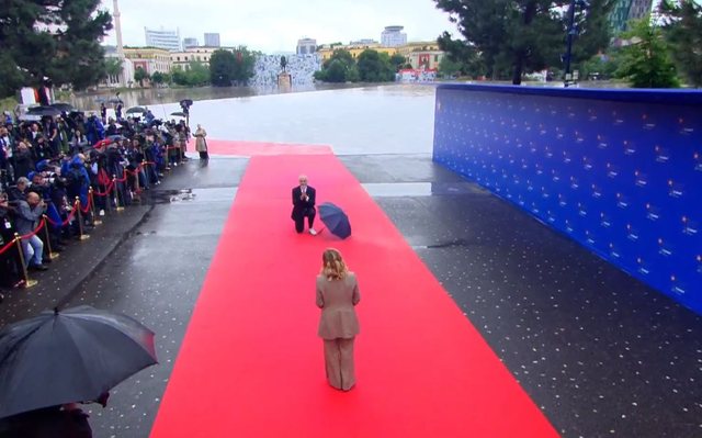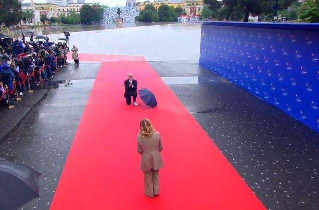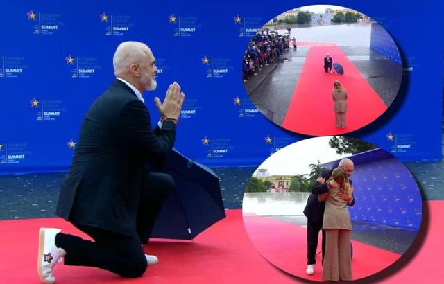 Kryeministri Edi Rama është ulur në gjunjë teksa homologia e tij italiane, Giorgia Meloni mbërriti në Sheshin Skënderbej. Kreu i qeverisë shihet teksa ulet në gjunjë ndërsa kryeministrja Giorgia Meloni mbërriti në tapetin e kuq. Ky moment u shoqërua me batuta nga Giorgia Meloni, e cila u shpreh se: ‘Edi stop! E bën vetëm që të jetë i gjatë sa unë’. Më pas, dy liderët shkëmbyen një përqafim në tapetin e kuq.
