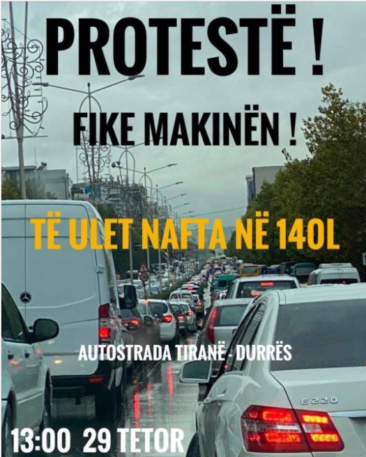 Nesër në orën 13:00 të mesditës do të zhvillohet një protestë për uljen e çmimit të karburantit. Sipas një njoftimi që qarkullon në media, në këtë orë, në autostradën Tiranë-Durrës do të fikën në mes të rrugës.