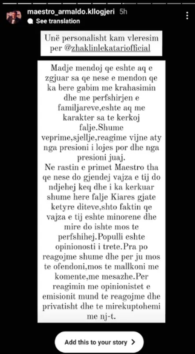 Në një status ajo shkruan se e respekton Zhaklinën dhe nëse ajo e mendon se ka thënë diçka gabim, ka aq karakter sa të kërkojë falje.