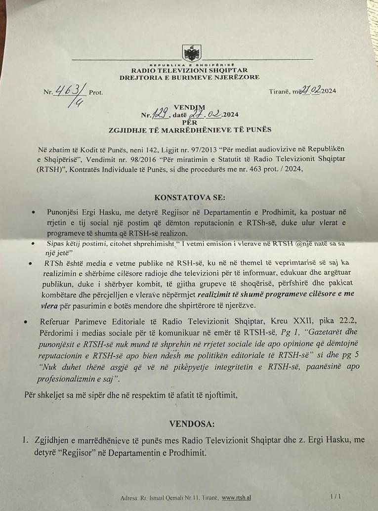 Zgjidhjen e marrëdhënieve të punës mes Radio Televizionit Shqiptar dhe z. Ergi Hasku, detyrë “Regjisor” në Departamentin e Prodhimit.