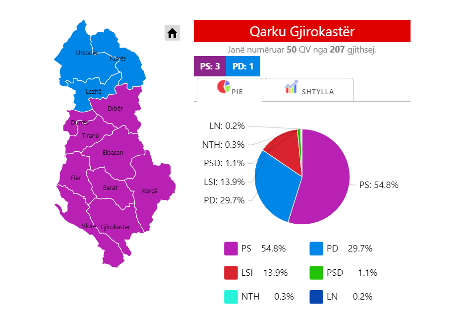 Kur jane numeruar 50 qendra votimi nga 207 ne qarkun Gjirokaster, Partia Socialiste kryeson me 54.8% te votave. Ndersa PD me 29.7%. LSI ka vetem 13.9% te votave. E perkthyer ne mandate deputetesh, do te thote qe PS merr 3 mandate ndersa PD mban 1 mandat. Vangjel Tavo rrezikon te mbetet jashte Kuvendit per here te pare pas 23 vitesh. ©argjiroja.net