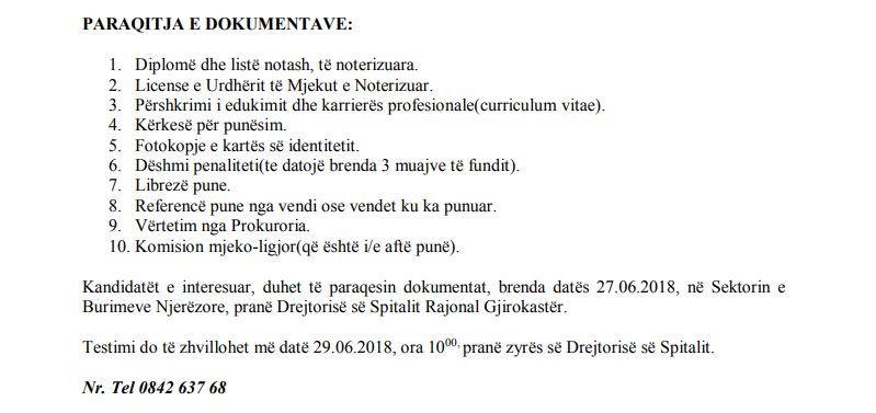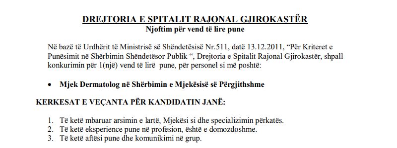 Spitali rajonal i Gjirokastrës shpall njoftimin për vend të lirë pune në pozicionin ‘Mjek Dermatolog në Shërbimin e Mjekësisë së Përgjithshme’. Aplikimet pranohen deri më datë 27 qershor. Më poshtë kërkesat dhe dokumentacioni.