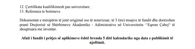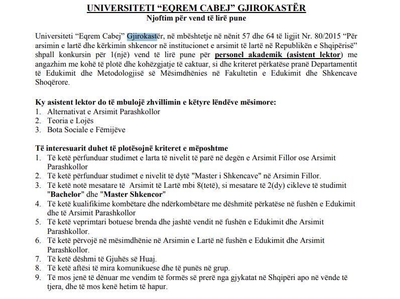 Universiteti ‘Eqrem Çabej’ në Gjirokastër shpall njoftimin për një vend të lirë pune në pozicionin ‘Asistent Lektor’, me angazhim me kohë të plotë, pranë Departamentit të Edukimit dhe Metodologjisë së Mësimdhënies në Fakultetin e Edukimit dhe Shkencave Shoqërore. Më poshtë kriteret dhe dokumentet që duhen për aplikim.