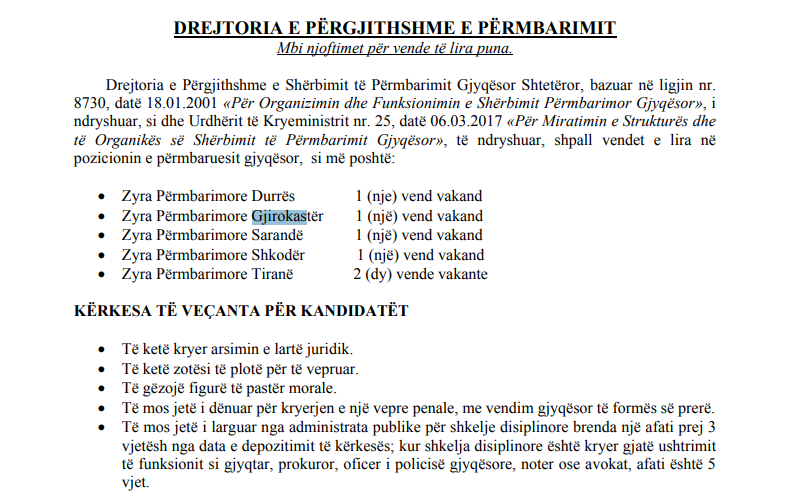 Drejtoria e Përgjithshme e Shërbimit të Përmbarimit Gjyqësor Shtetëror shpall vendet e lira në pozicionin e përmbaruesit gjyqësor në disa qytete të vendit. Mes tyre është edhe Gjirokastra. Për dokumentet dhe kriteret e aplikimit shihni më poshtë njoftimin e plotë.
