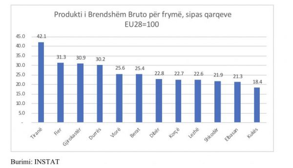 Të dhënat tregojnë se vetëm qarku i Tiranës e ka PBB-në për frymë sa 42 për qind e mesatares së BE-së teksa 8 qarqe të tjera i kanë të ardhurat për frymë më pak se 25 për qind e të nivelit mesatar të BE-së për vitin 2017.
