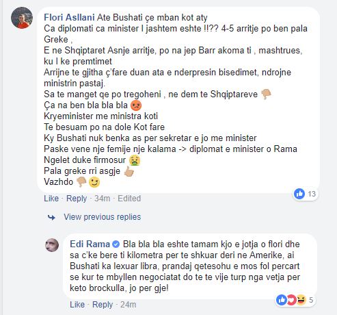 Kryeministri Edi Rama ka njoftuar në Facebook se sonte në mbrëmje në emisionin ‘Opinion’ do të jetë i ftuar ministri i Jashtëm Ditmir Bushati, për të folur rreth negociatave me Greqinë. Në radhën e shumë të komentuesve të këtij statusi të Ramës, është edhe një i ri nga Gjirokastra. Flori Asllani, i cili jeton në SHBA, ka replikuar ashpër me Kryeministrin. I riu nga Gjirokastra është shumë i ashpër me ministrin Bushati, por Rama i del në mbrojtje, duke mos harruar të lëshojë edhe batuta. Në fotot më poshtë është debati mes tyre.
