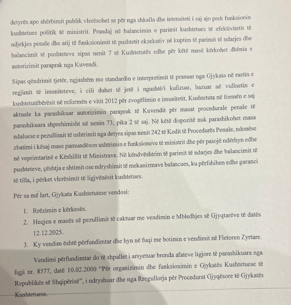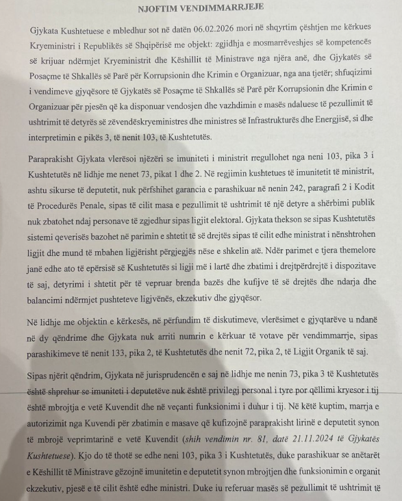 Gjykata Kushtetuese e mbledhur sot në datën 06.02.2026 mori në shqyrtim çështjen me kërkues Kryeministri i Republikës së Shqipërisë me objekt: zgjidhja e mosmarrëveshjes së kompetencës së krijuar ndërmjet Kryeministrit dhe Këshillit të Ministrave nga njëra anë, dhe Gjykatës së Posaçme të Shkallës së Parë për Korrupsionin dhe Krimin e Organizuar, nga ana tjetër; shfuqizimi i vendimeve gjyqësore të Gjykatës së Posaçme të Shkallës së Parë për Korrupsionin dhe Krimin e Organizuar për pjesën që ka disponuar vendosjen dhe vazhdimin e masës ndaluese të pezullimit të ushtrimit të detyrës së zëvendëskryeministres dhe ministres së Infrastrukturës dhe Energjisë, si dhe interpretimin e pikës 3, të nenit 103, të Kushtetutës.