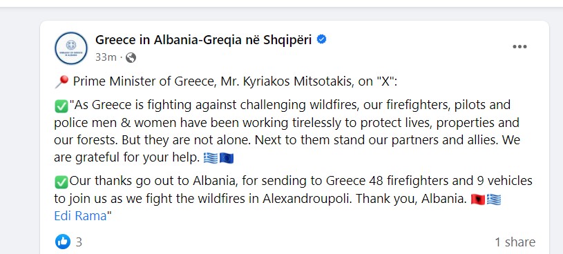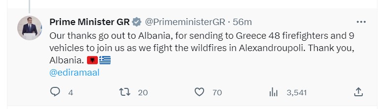 “Falënderimet tona shkojnë për Shqipërinë për dërgimin në Greqi të 48 zjarrfikësve dhe 9 mjeteve, që do të na bashkohen teksa ne po luftojmë flakët në Aleksandropuli. Faleminderit Shqipëri”, shkruan Mitsotakis në Twitter.