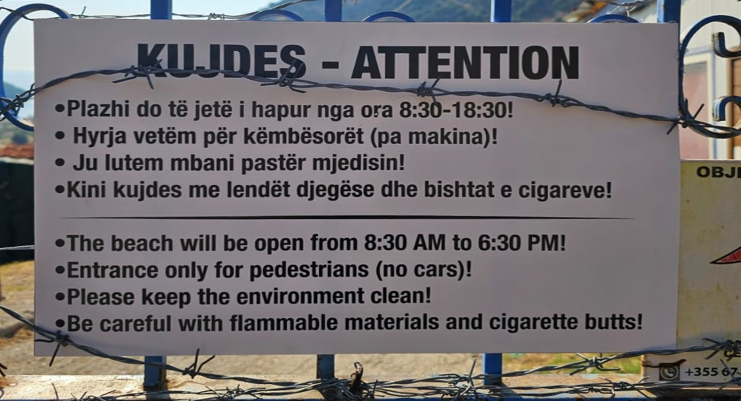 Megjithatë, ky nuk është një lajm edhe aq i mirë. Një tabelë e vendosur mes telave me gjemba njofton në shqip dhe anglisht se pushuesit mund të shkojnë në plazh, por pa automjete. Ndërsa orari i lejuar do të jetë nga ora 08:30 – 18:30.