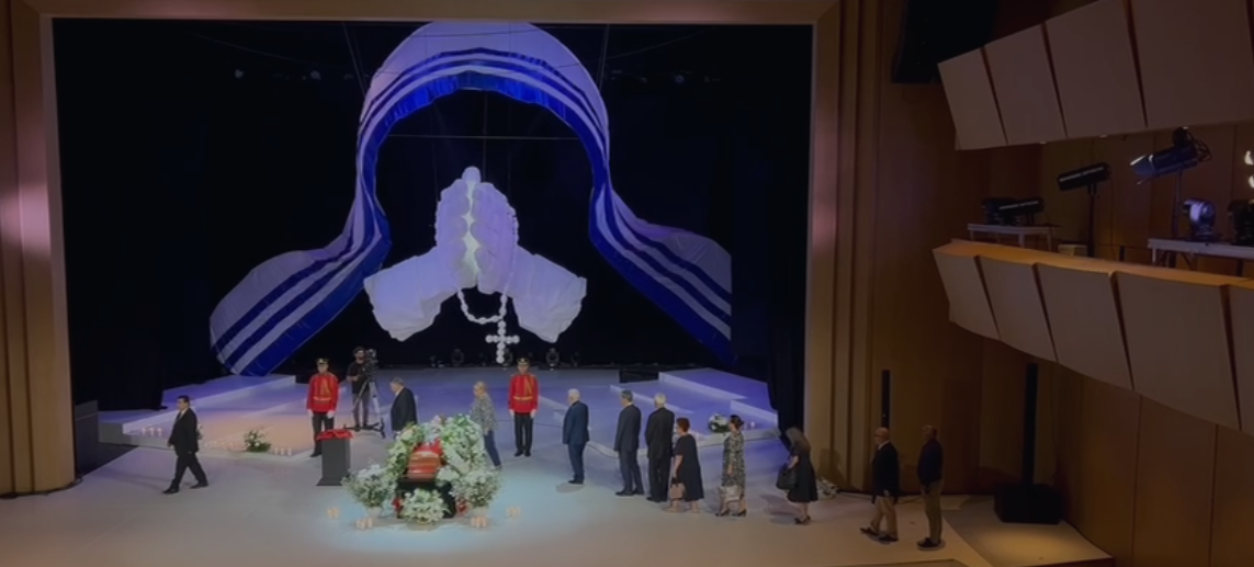 Mbi arkëmortin me trupin e pajetë të Ismail Kadaresë, është vendosur një instalacion i madh që shënon figurën e shenjtores shqiptare Nënë Tereza. Po ashtu, në hyrje të Teatrit Kombëtar të Operës dhe Baletit është vendoset edhe me libra të të ndjerit Kadare të përkthyer në 45 gjuhë të botës.