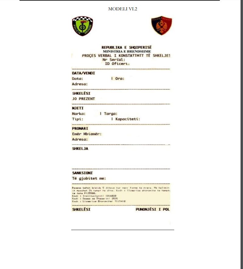“Procesverbali i prodhuar nga pajisjet digjitale është sipas modelit VI.2, që i bashkëlidhet këtij vendimi dhe është pjesë përbërëse e kësaj rregulloreje dhe duhet të përmbajë të njëjtët tregues të procesverbalit të modelit VI.1 të saj.